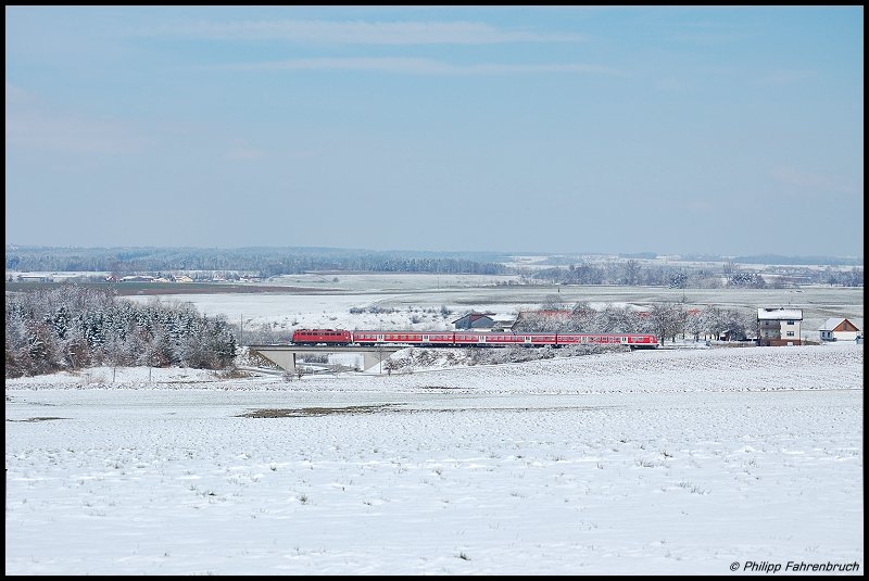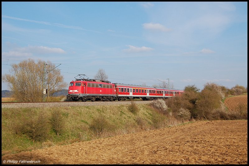 Wenn der Karlsruher Streikt... - 110 425 leistet am Morgen des 13.05.08 Steuerwagenersatz für RB 37141 von Aalen nach Donauwörth, aufgenommen bei Lauchheim an der Riesbahn (KBS 995). Am Zugschluss läuft 110 508 abgebügelt mit. P.F.