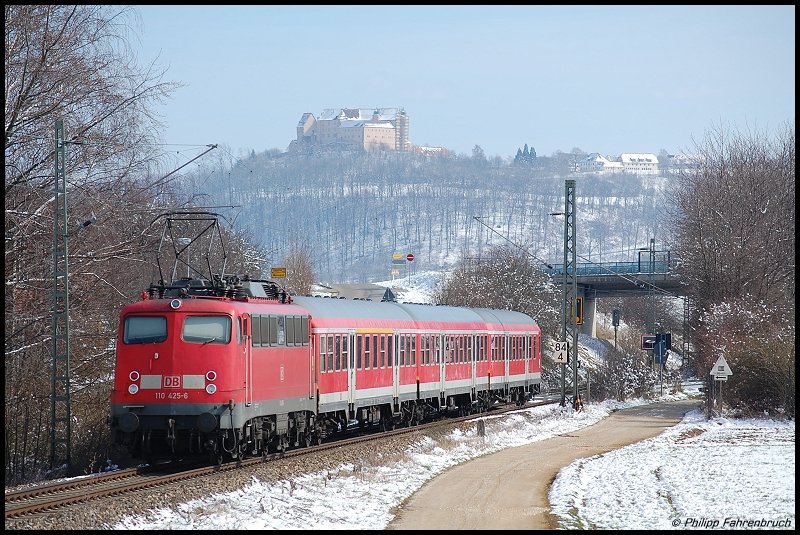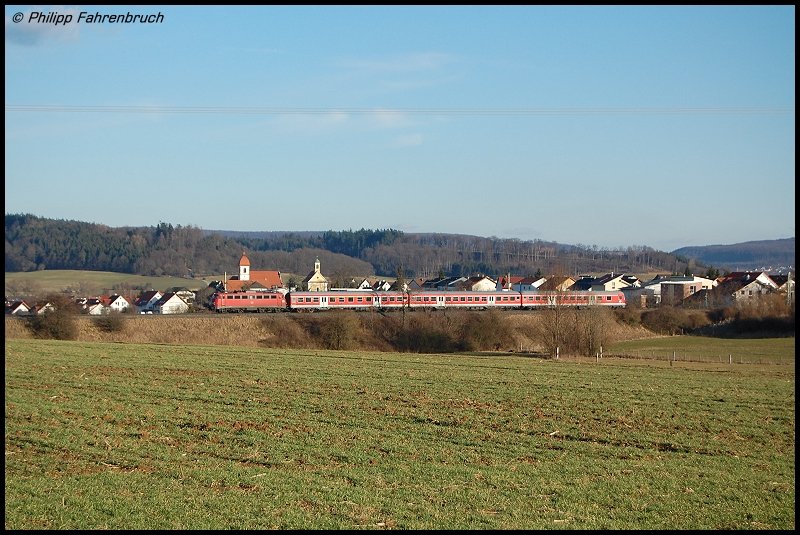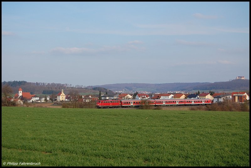 110 425 befördert am Morgen des 13.05.08 RB 37141 von Aalen nach Donauwörth, aufgenommen bei Lauchheim an der Riesbahn (KBS 995). Im Hintergrund befindet sich die Kapfenburg. Der nächste Halt des Zuges ist Aufhausen(Württ). P.F.