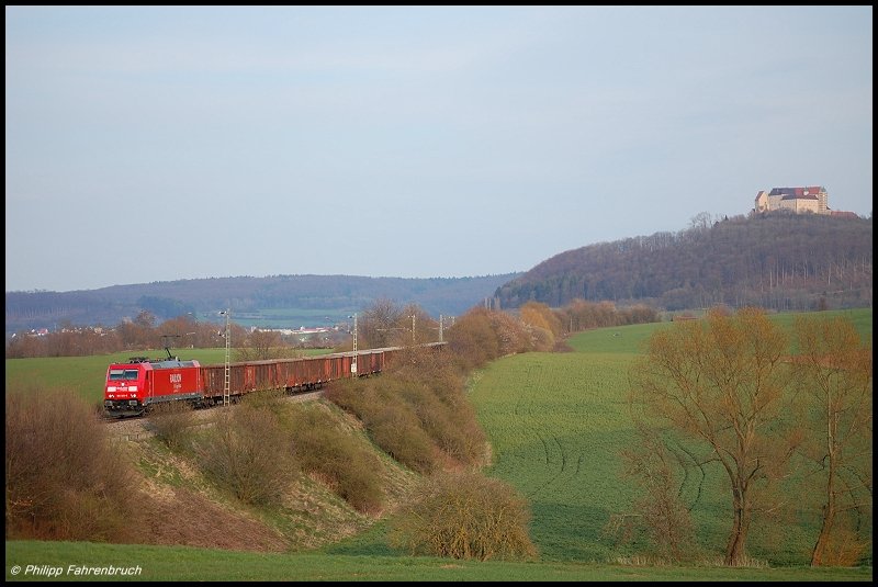 185 305 zieht am 17.04.08 CS 60706 von Harburg(Schwaben) nach Heilbronn, aufgenommen bei Westhausen an der Riesbahn (KBS 995). Schubtriebfahrzeug war 140 173. P.F.