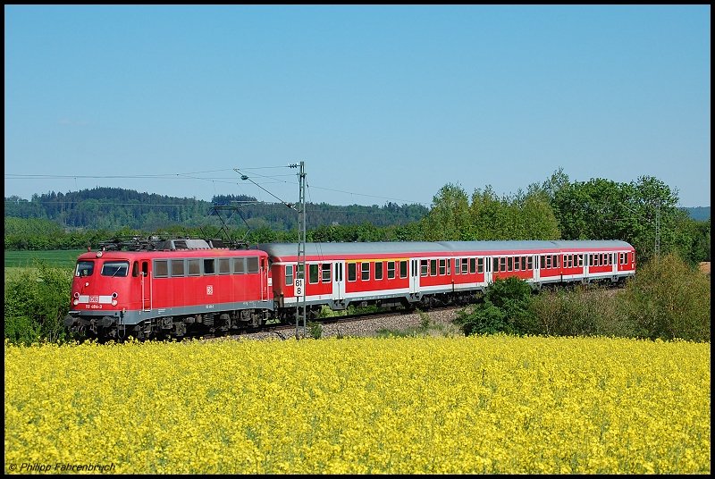 Am 11.05.08 zieht 110 484 ihre RB 37162 von Donauwörth nach Aalen, aufgenommen am Km 81,8 der KBS 995 (Riesbahn) in Höhe des ehem. Hp Frankenreute. P.F.