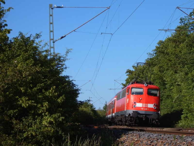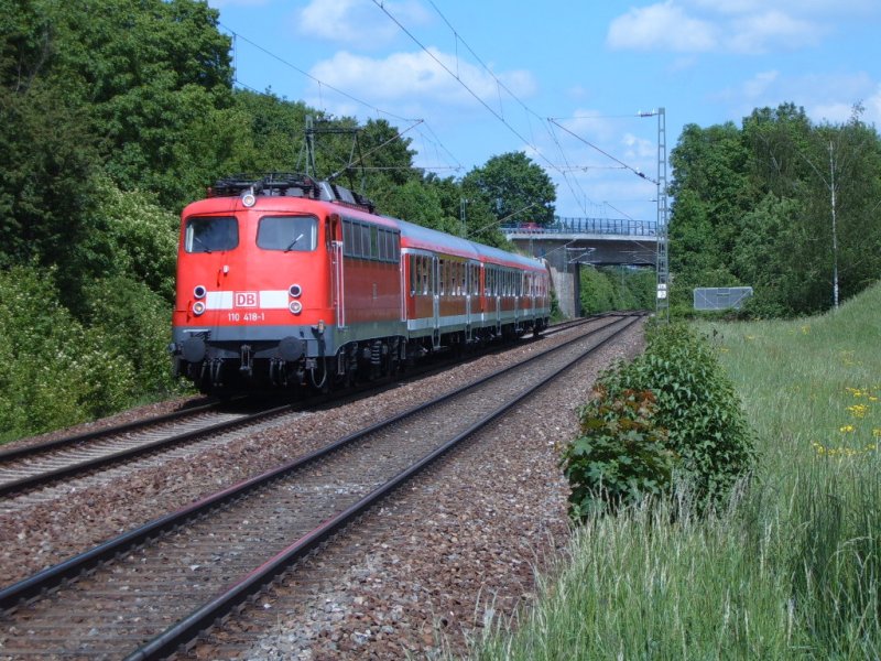 110 418-1 mit der RB 37164 aus Donauwörth vor ihrem Fahrtziel, der Knotenbahnhof Aalen. Hier hat sie gerade das Blocksignal von Wasseralfingen passiert. Foto: Freitag, 18.05.07. P.F.