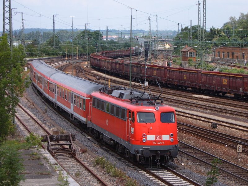 BR 110 446-2 mit der RB 37153 von Aalen über Bopfingen und Nördlingen nach Donauwörth, bei der Ausfahrt am 04.06.07 aus dem Lauchheimer Regionalbahnhof. P.F.