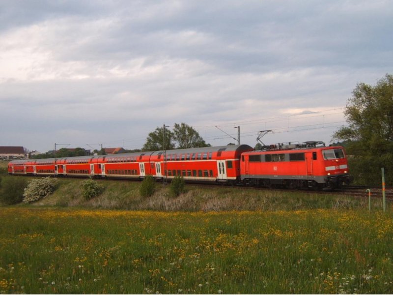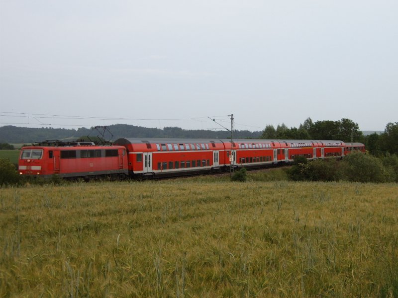 Das Schweinchen fährt am 26.05.07 den RE 4198 von München HBF nach Stuttgart HBF, hier am Streckenkilometer 81,7 der Riesbahn (KBS 995). Nächster Halt ist Goldshöfe. P.F.