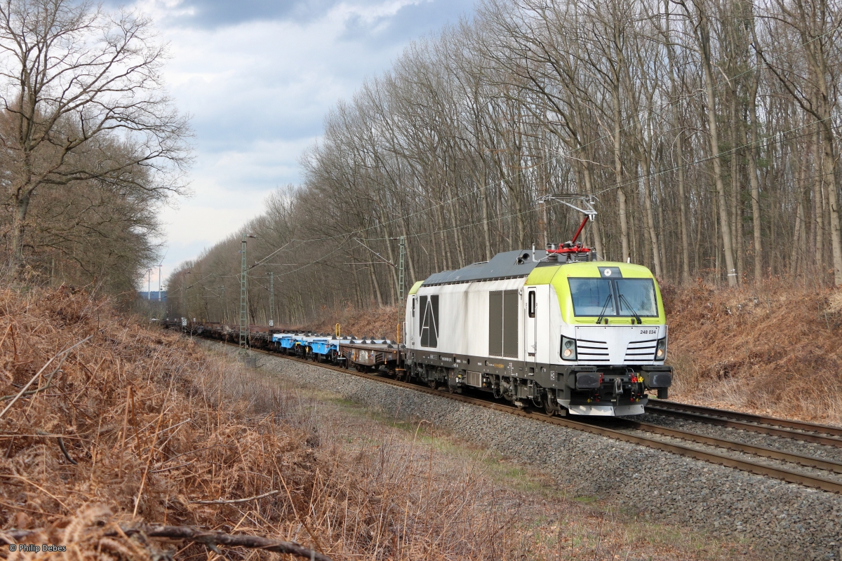 Die an die Dortmunder Eisenbahn GmbH (DE) vermietete SIEMENS Vectron Dual Mode 248 034-1  Phoenix  (90 80 2248 034-1 D-DE) der Captrain Deutschland GmbH fährt am 25 Juni 2024, mit einem Coilzug (Wagen der Gattung Shimmnis-ttu der Ermewa) durch den Bahnhof Scheuerfeld/Sieg in Richtung Siegen.