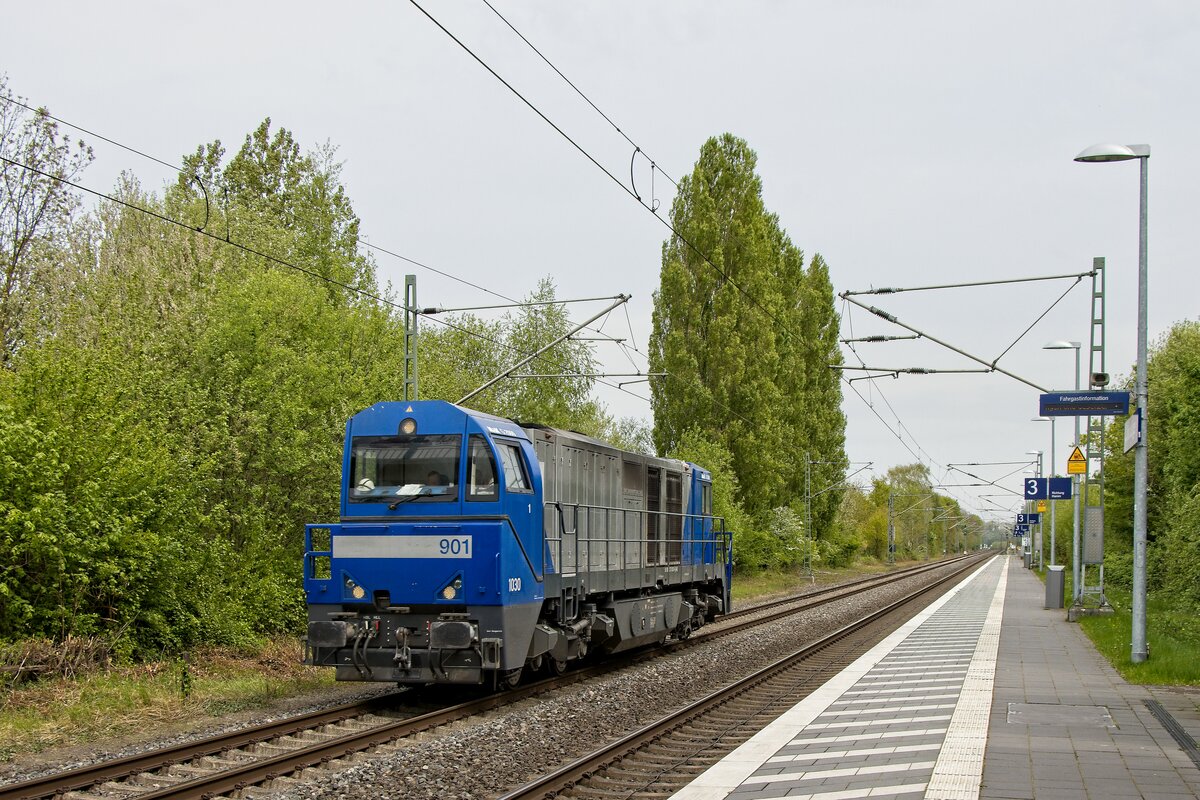 Lok 1030 der Dortmunder Eisenbahn, ehemals Lok 901 der RBH, als Triebfahrzeugfahrt im Bahnhof Nordbögge (29.04.2022)