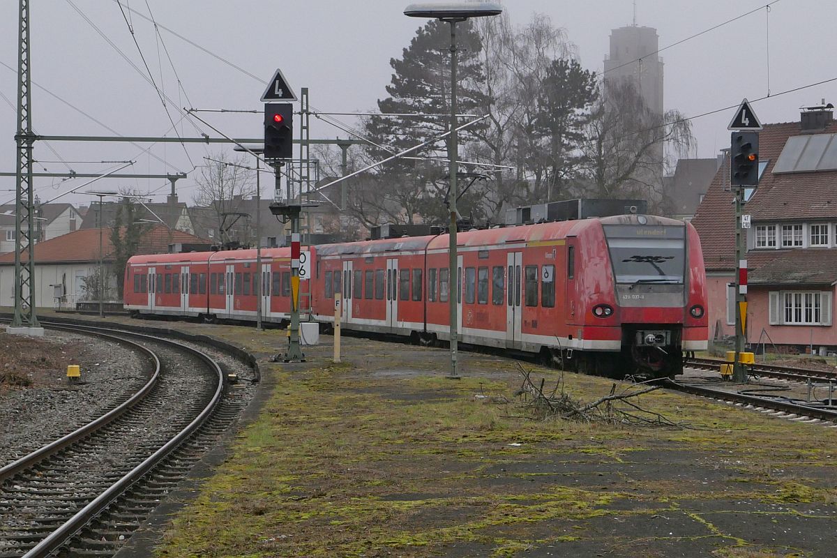 Ein ex Saarländer düst für die Bodensee-Oberschwaben-Bahn über die Südbahn. 426 037-8, welcher noch den früheren Taufnamen Illingen trägt, erreicht in Kürze mit der RB91 den Endbahnhof Aulendorf. (30.04.2022)