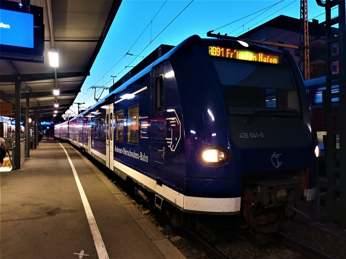 426 041-0 Der Bodensee Oberschwaben Bahn als RB91 nach Friedrichhafen Hafen am 17.7.22 in Friedrichshafen Stadt zusammen mit 426 043