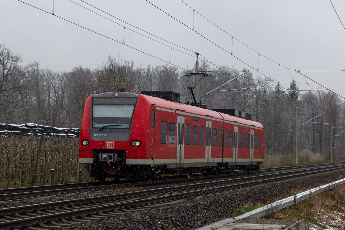 Rot statt blau (|) - Der am 23.03.2022 noch nicht blau folierte 426 537-7 der Bodensee-Oberschwaben-Bahn befindet sich kurz vor Meckenbeuren als RB 91 / 87589 auf der Fahrt von Ravensburg nach Friedrichshafen Stadt