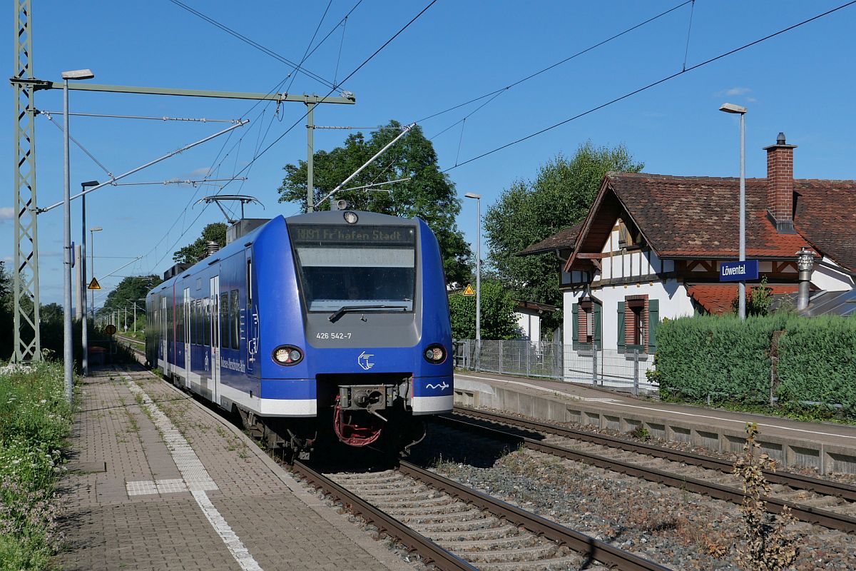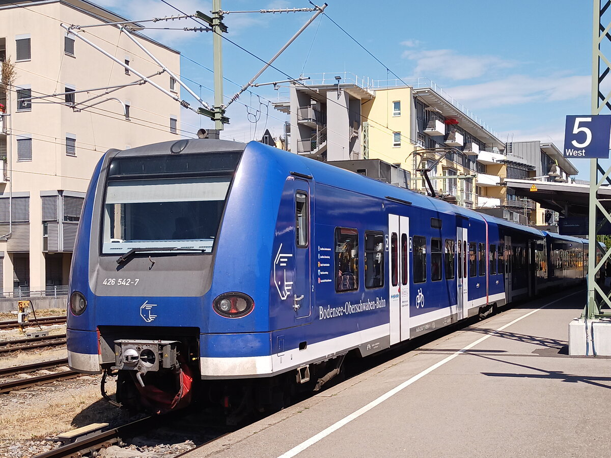 Auf der Fahrt von Ravensburg nach Friedrichshafen Stadt erreicht 426 542-7 der Bodensee-Oberschwaben-Bahn am 11.07.2022 als RB 91 / 87589 den vorletzten Halt, Friedrichshafen Löwental