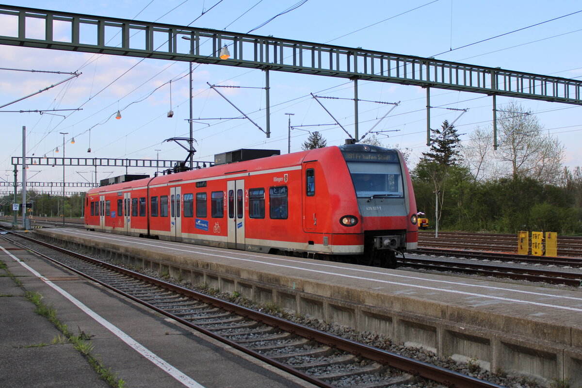 Ein ex Saarländer  Quietschie  426 037-8, welcher noch den früheren Taufnamen Illingen trägt,der Bodensee-Oberschwaben-Bahn steht in Aulendorf zur Fahrt nach Friedrichshafen. (01.05.2022)