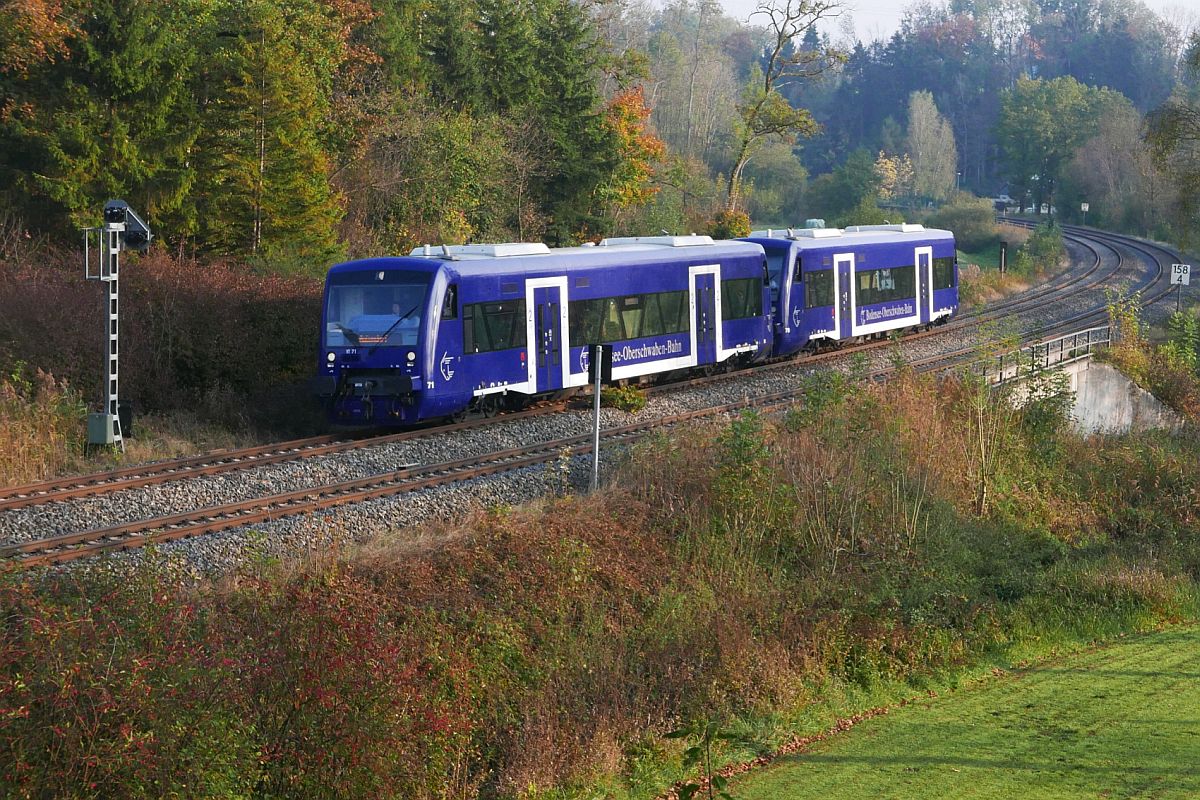 Elektrifizierung Südbahn - BOB-Triebfahrzeuge vorher# - Am 20.10.2018 haben VT 71 (650 746) und VT 70 (650 745) der Bodensee-Oberschwaben-Bahn als BOB 87584 von Friedrichshafen Hafen nach Aulendorf kurz nach dem Verlassen des Schussentobel bei Kilometer 158.4 die Schussen auf den letzten fünf Kilometern sieben Mal überquert