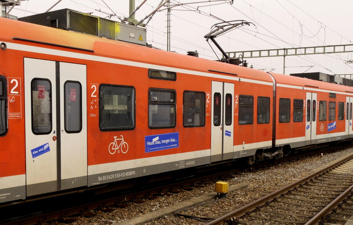 Bei genauerem Hinsehen erkennt man, dass die Folierung von 426 042 wohl unter ziemlichem Zeitdruck ausgeführt wurde. Mal schauen, ob die Folgeexemplare wirklich komplett blau sind. 426 042, Friedrichshafen Stadt, 21.3.22.