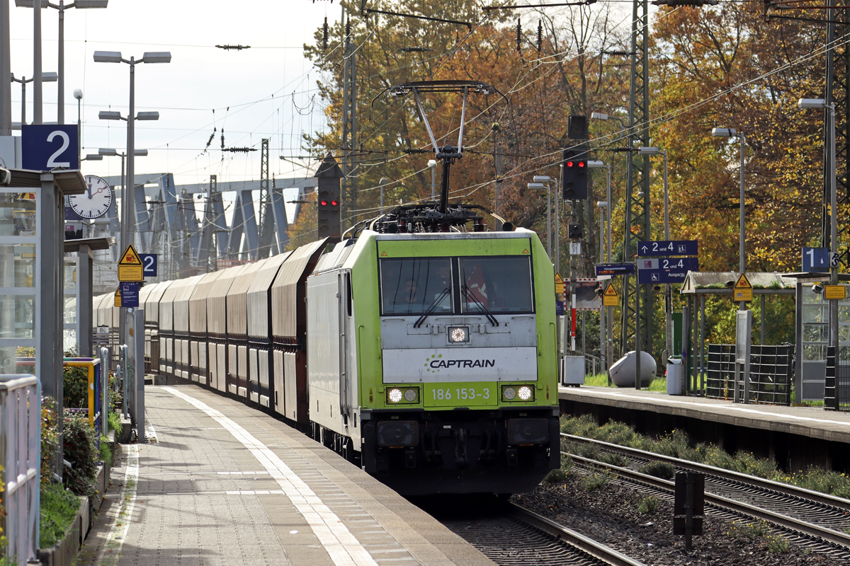 Captrain Deutschland CargoWest GmbH, Gütersloh [D] mit der Akiem Lok "187 011" [NVR-Nummer: 91 80 6187 011-2 D-AKIEM] und einem KLV-Zug am 05.11.24 Höhe Bahnhof Berlin-Hohenschönhausen. Lothar Stöckmann