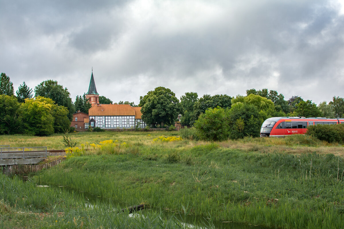 Zwei Lint 41 Triebwagen der Städtetorlinie als RE2 auf dem Weg von Bad Kleinen in Mecklenburg in die Hansestadt Lübeck wenige Meter hinter dem idyllischen Bahnhof Grieben Jens Hubers