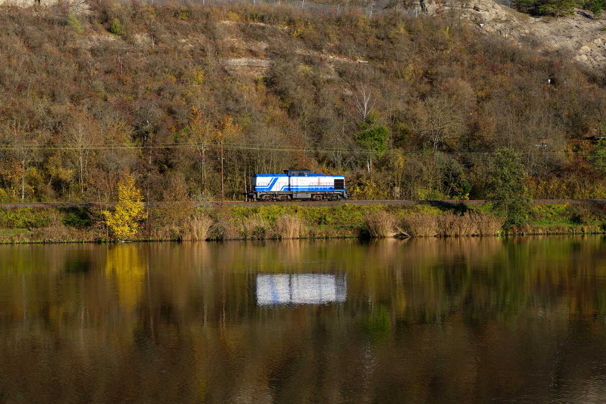 D&D Eisenbahngesellschaft mbH, Hagenow mit ihrer V 100 "1702" (NVR: "92 80 1203 130-0 D-DUD") mit dem Gleisbaukran KIROE KRC 810 T der Firma MGW Gleis- und Weichenbau-GmbH & Co. KG Berlin (99 80 9219 001-1 -MGWB) und Schutzwagen am Haken am 07.11.23 Höhe Bahnhof Niederndodeleben. Lothar Stöckmann