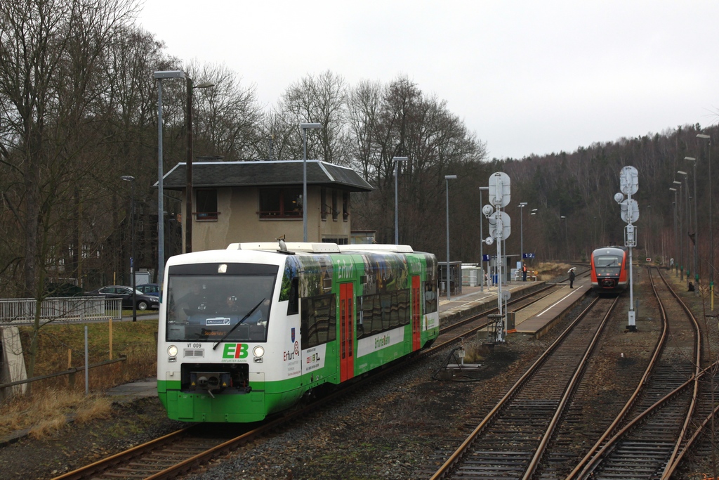 Am 12.03.2012 erfolgten auf Strecken in Ostthüringen GPS-Meßfahrten in Vorbereitung der Übernahme der Verkehrsleistungen durch die Erfurter Bahn. Dabei wurde auch die KBS546 befahren, hier der VT009 als DLr92224 bei Ausf. Zeulenroda unt. Bf. Im Hintergrund wartet 642 019/519 als RB16460 nach Weida. Rüdiger Ulrich