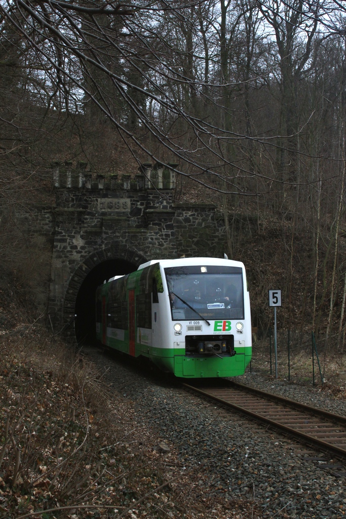 Rückfahrt des VT009 der Erfurter Bahn als DLr91597 (GPS-Meßfahrt) am 12.03.2012 von Hof nach Gera, bei Verlassen des Schloßbergtunnels in Weida. Rüdiger Ulrich