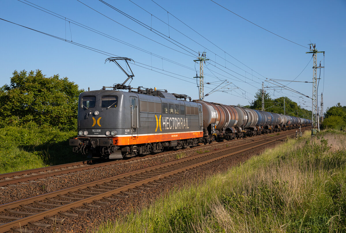 Hectorrail mit "162.007" Name: Beckert (NVR: "91 80 6 151 134-4 D-HRDE") und einem Kesselwagenzug (leer) Richtung Stendell am 06.04.23 Durchfahrt Bahnhof Berlin Hohenschönhausen. Lothar Stöckmann
