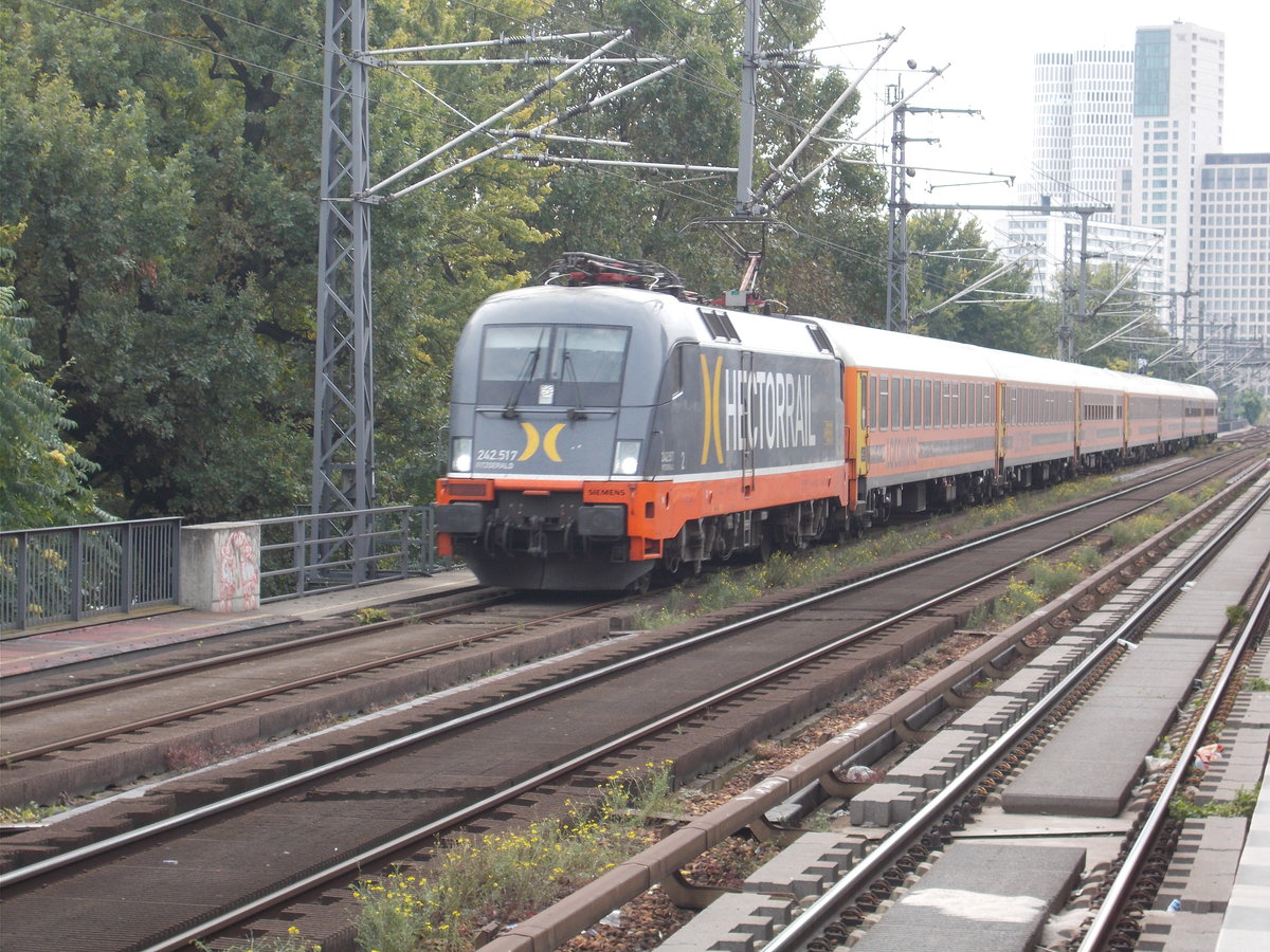 242 517 von Hectorrail zieht am 08.04.2017 den Locomorezug 1819 nach Stuttgart am derzeit im Umbau befindlichen Bahnhof Warschauer Straße vorbei. Christopher Pätz