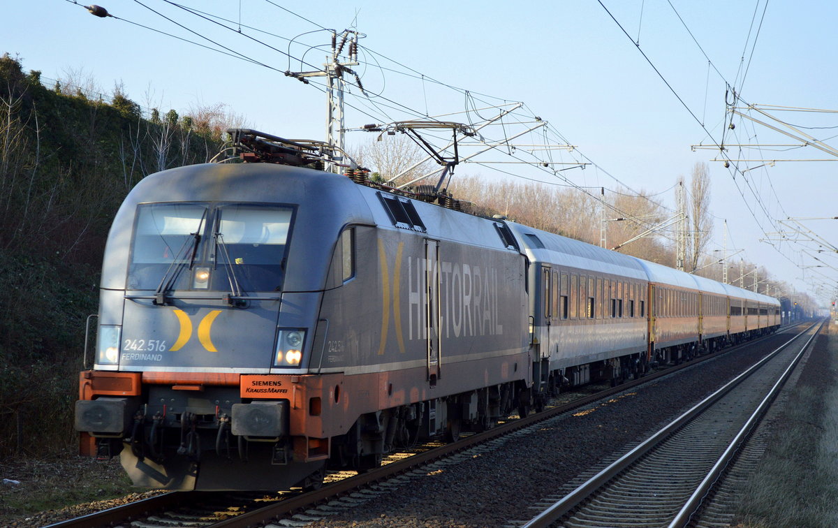 242.516 "Ferdinand" (182 516-5) Hector Rail AB mit dem Locomore (LOC 1819) von Berlin-Lichtenberg nach Stuttgart Hbf in Nennhausen. Netten Gruß an den TF! 08.02.2018 Stephan Kemnitz