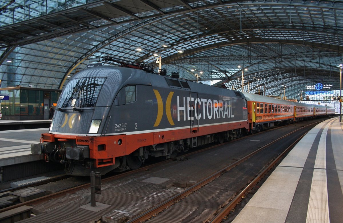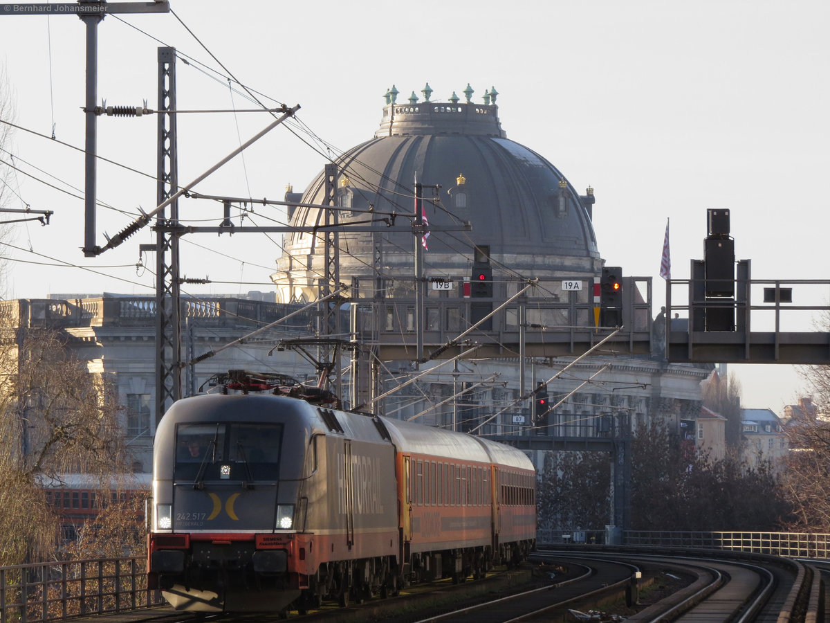 Gezogen wird der Locomore-Zug von einem HectorRail-Taurus. Im Bild 242 517 "Fitzgerald", alias 91 80 6182 517-3 S-HCTOR. Berlin-Lichtenberg, 6.1.17.