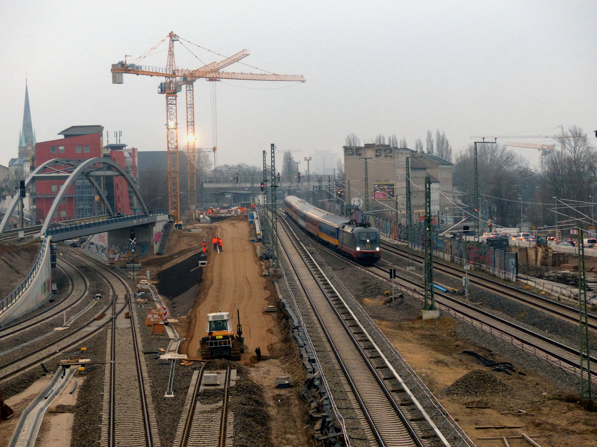 Im Hintergrund ist die Ringbahnhalle des Bahnhofs Ostkreuz zu sehen, die Gleise zwischen dem Zug und der S-Bahn sind derzeit  tote Gleise . Die S-Bahn wird später auf dem Gleis fahren, das sie hier noch mittels Weiche verlässt. Die auf die Ringbahnhalle zuführende Brücke ist die Südkurve, die eine Verbindung zwischen Warschauer Straße und Treptower Park (wieder)herstellt.