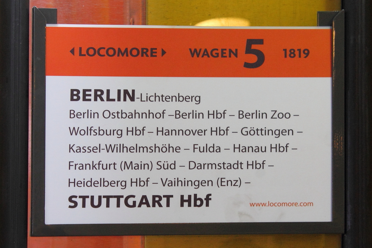 Zuglaufschild des LOC 1819 nach Stuttgart am 18.12.2016 in Berlin-Lichtenberg.