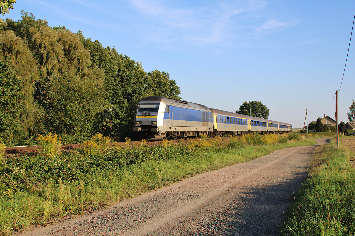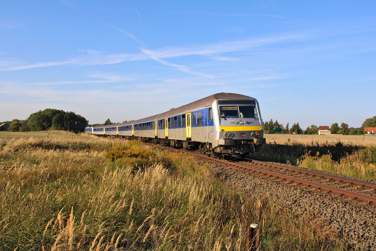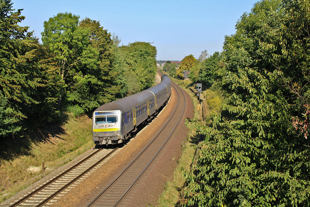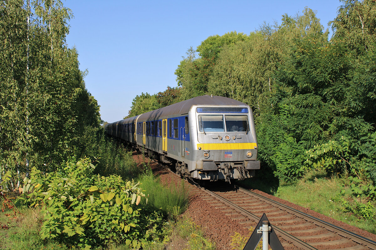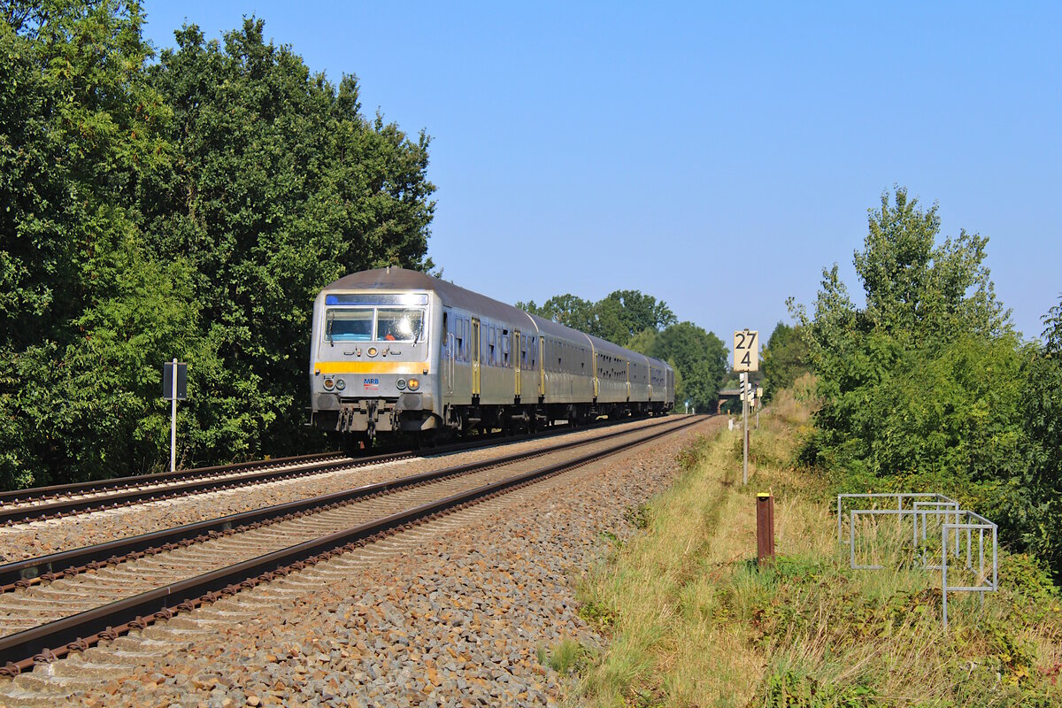 Während die letzten beiden Waggons von der WFL angemietet sind, ist der Dosto hinter der Lok von der DB. Hintergrund ist die Ansaugung der Klimaanlage von der Seite, um die Passagiere nicht mit den Dieselabgasen zu belästigen. Bei den WFL-Dostos erfolgt die Ansaugung über das Dach.