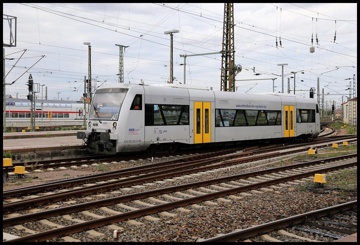 Neben den 2 Lokbespannten RE6 Garnituren mischte sich als dritter Umlauf ein 648er unter. Hier passiert er Leipzig Werkstättenstraße.