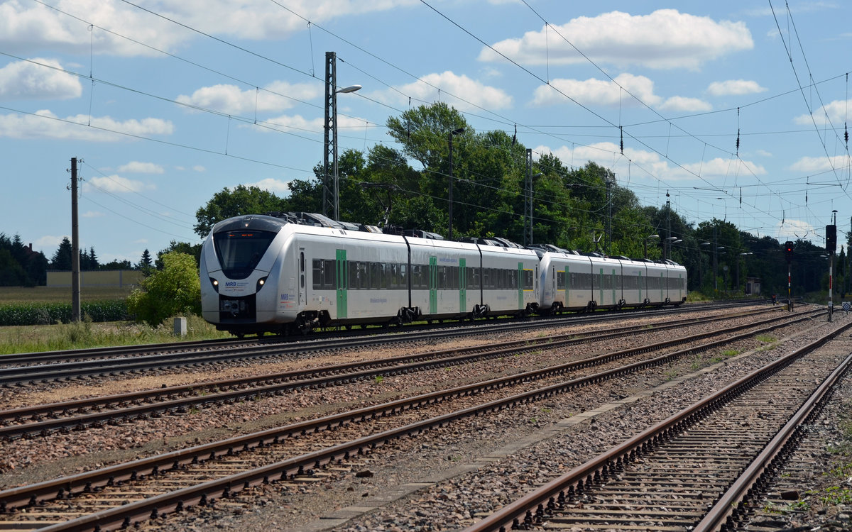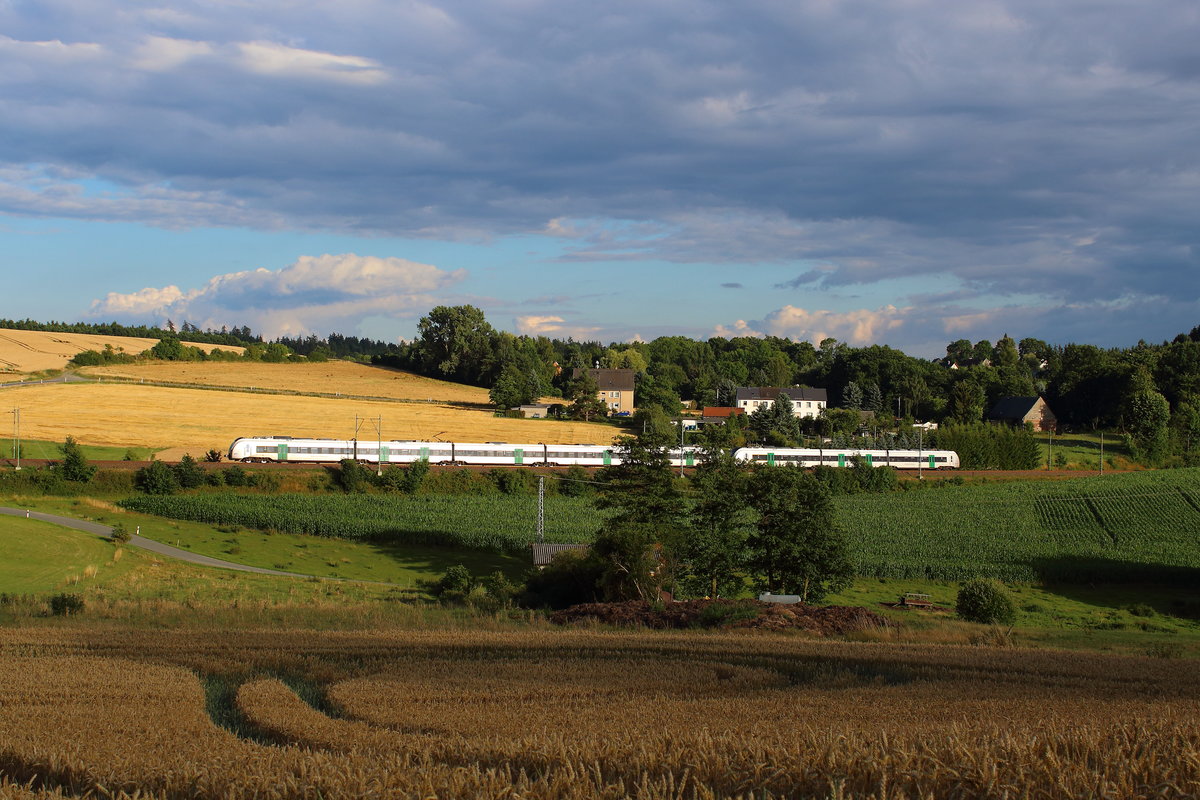 Ein Tandem aus drei- und fünfteiligen Coradia Continental fuhr am 05.08.17 wegen der Sperrung der Strecke Dresden - Hof über Riesa. 1440 214 führt hier seinen kleinen Bruder durch Weißig (b. Riesa) Richtung Dresden. Martin Schneider