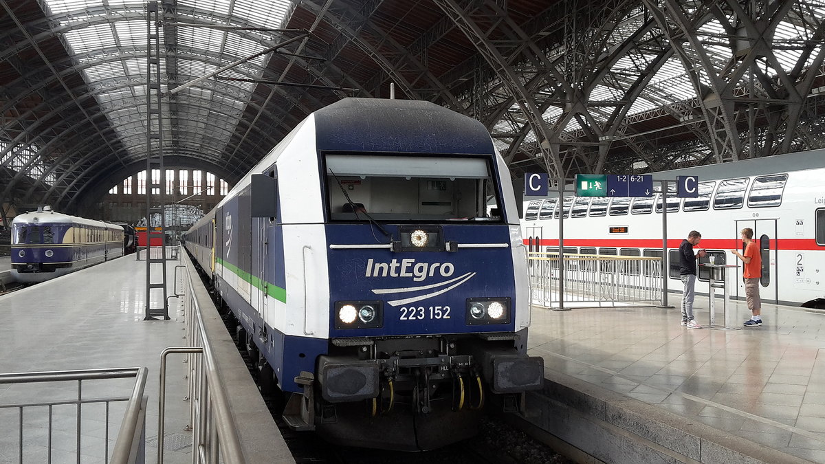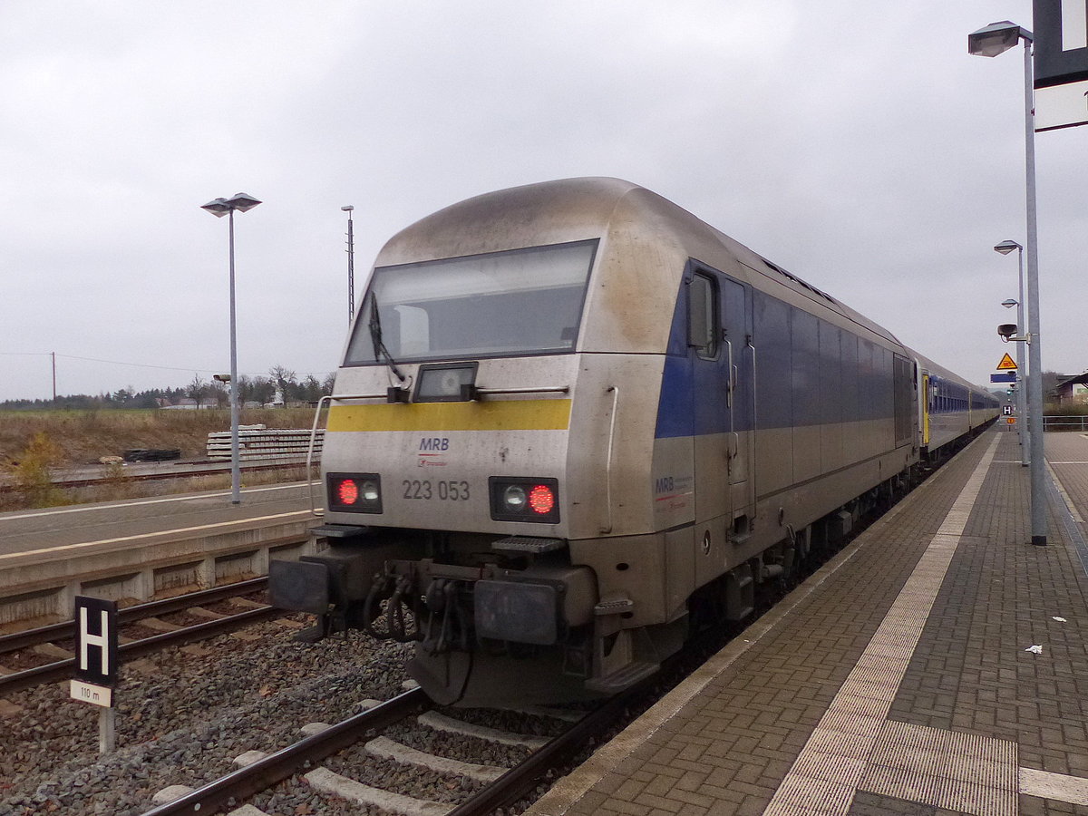 223 055 der MRB schob am 03.12.17 einen RE nach Chemnitz aus dem Leipziger Hbf heraus. Bei diesem Zug wurde, vielleicht wegen Wagenmangel vorn und hinten mit Steuerwagen gefahren. Martin Schneider