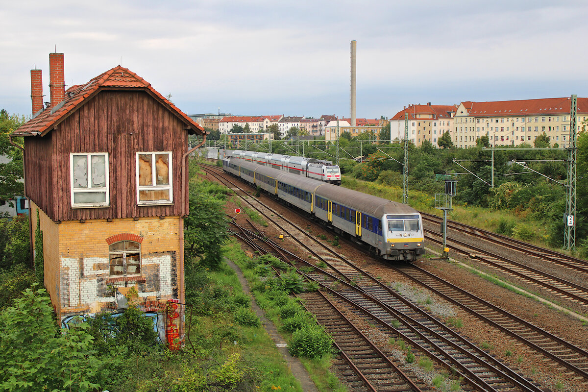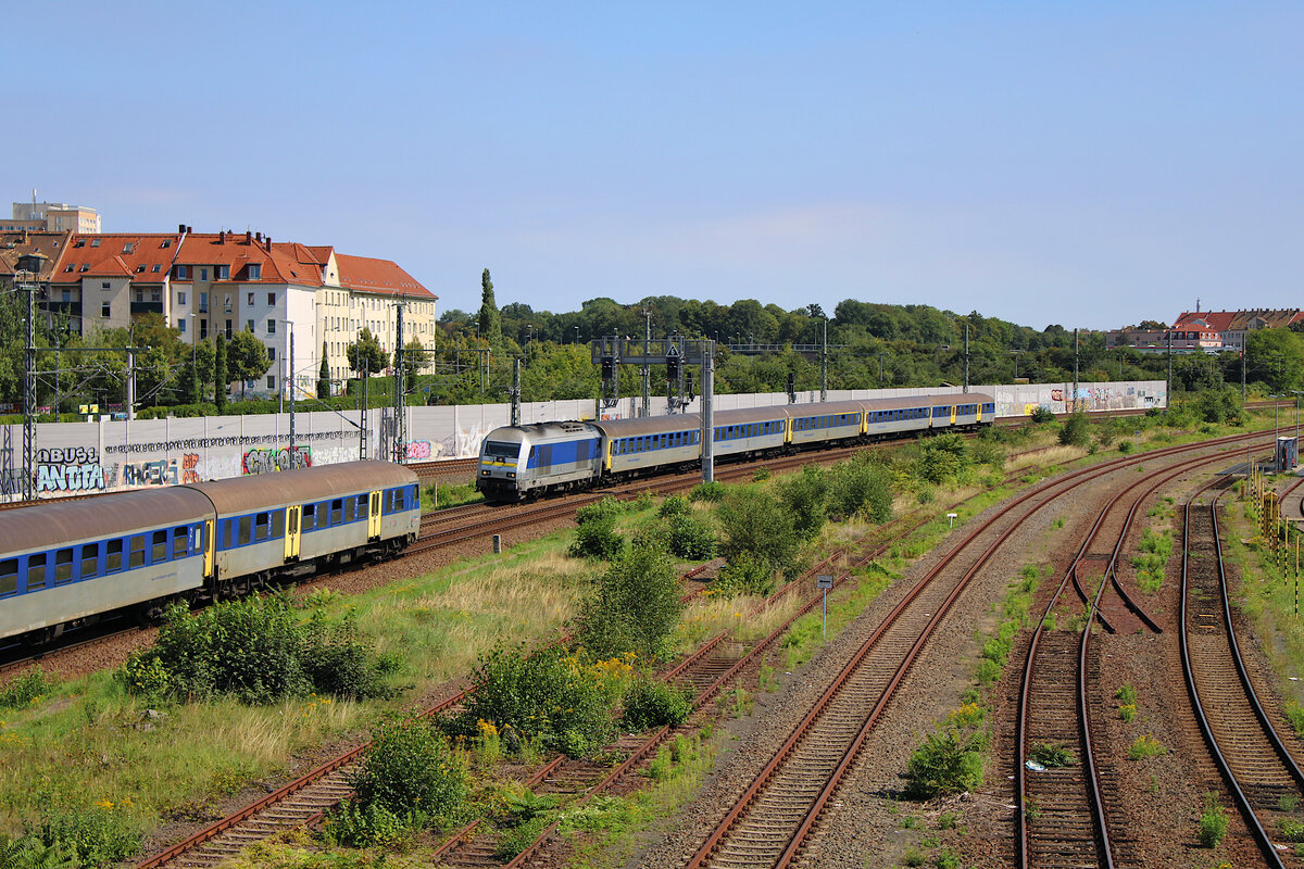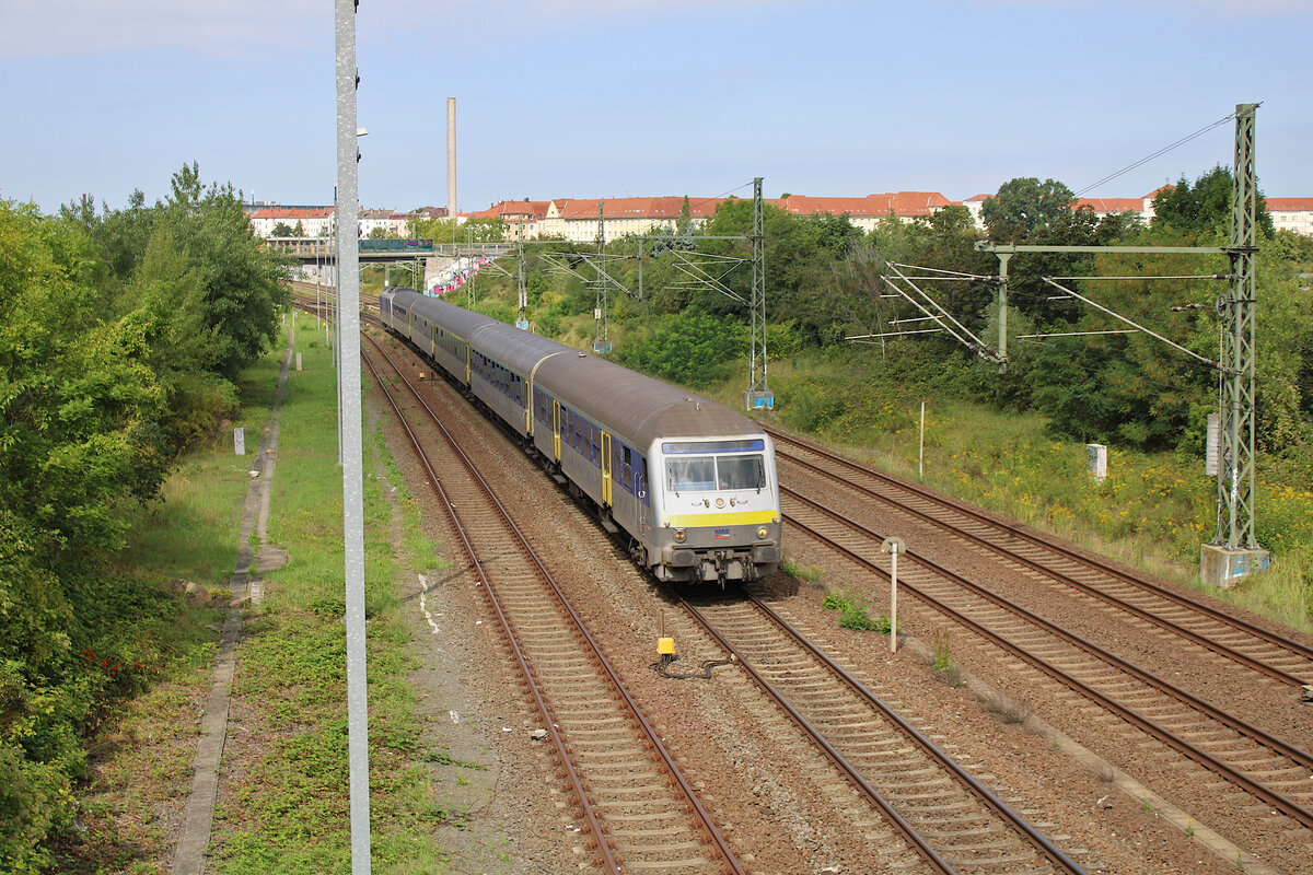 Ein RE6 (Leipzig Hbf - Chemnitz Hbf) der MRB rollt mit einem Wittenberger Steuerwagen in Leipzig-Volkmarsdorf zur Kreuzung mit einem Gegenzug ein. (21.08.2023) OMSIJakob LP