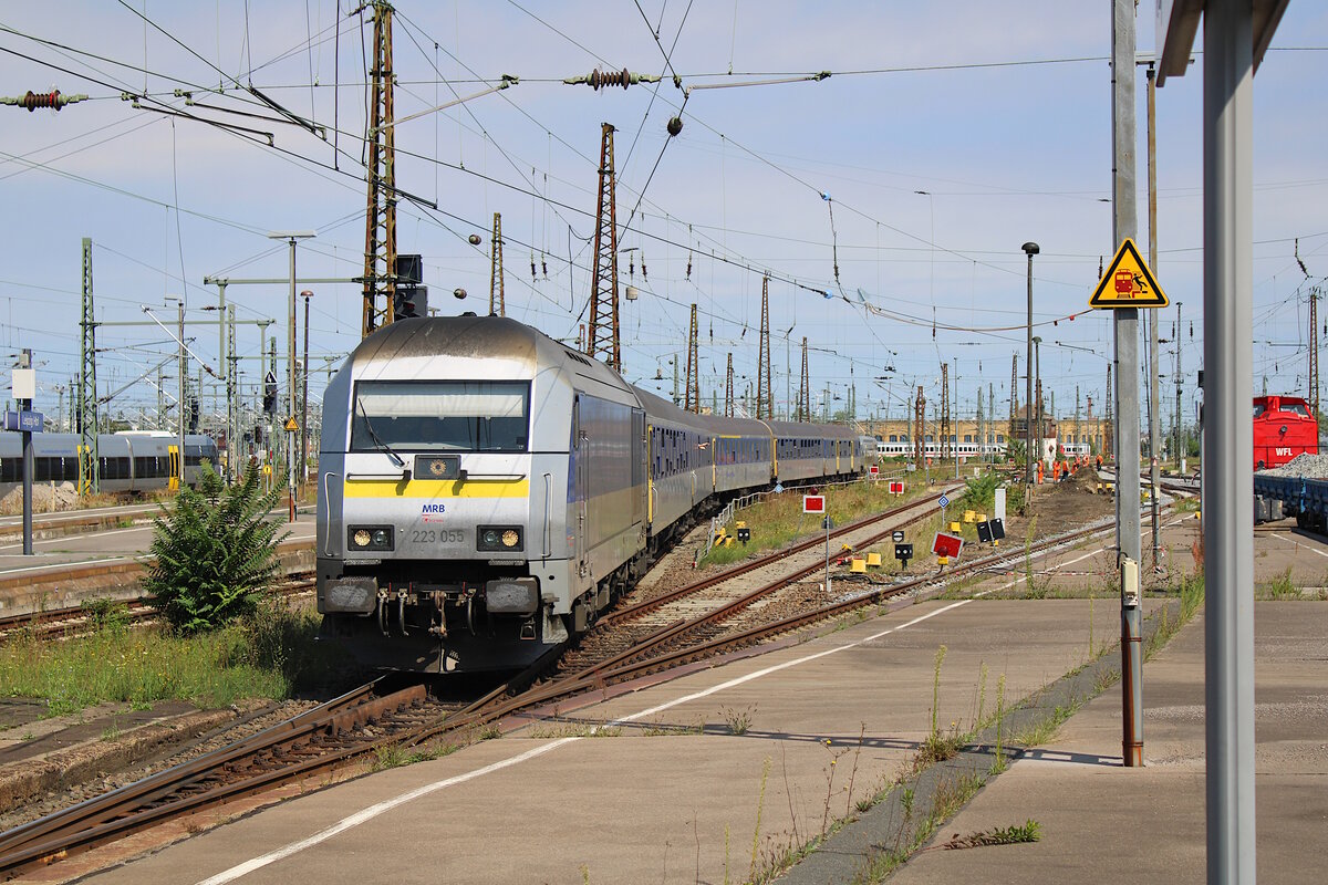 MRB 223 053 fährt mit ihrem RE6 durch Leipzig-Volkmarsdorf in Richtung Leipzig Hbf, während bereits der Gegenzug nach Chemnitz die Kreuzung abwartet. (21.08.2023) OMSIJakob LP