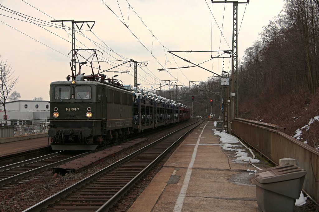 Lokportrait von der 142 001-7 (MTEG), sie kommt am 30.01.2014 mit einem Ganzzug tschechische Automobile aus Bad Schandau durch Dresden Reick gefahren. Neben der Systemtrennstelle von DB und ČD gibt es auf den Ferngleisen, in Reick, seit Mitte Januar einen neuen "Bügel ab" Abschnitt. Matthias Hartmann