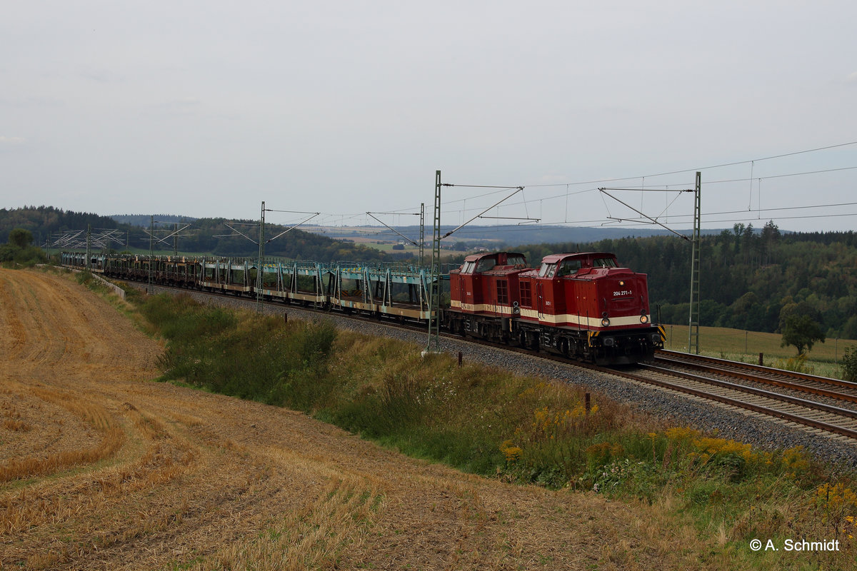 DGS 61464 von Regensburg nach Zwickau Mosel mit MTEG V100 Doppel in DR rot 204 271 und 204 425 bei Herlasgrün im Vogtland am 03.09.2016. Andreas Schreiber