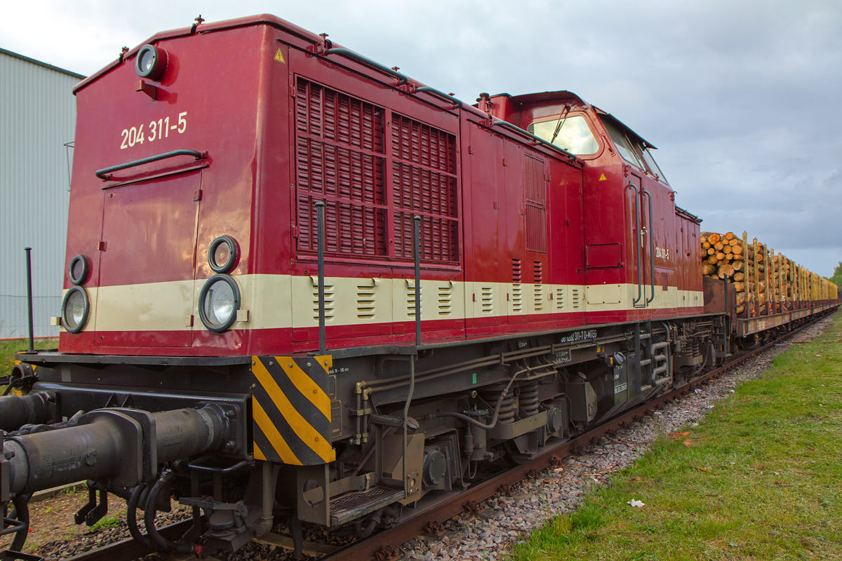2 Loks der BR 202 der MTEG stehen mit einem beladenen Holzzug auf der Torgelower Ladestrasse. -14.05.2014