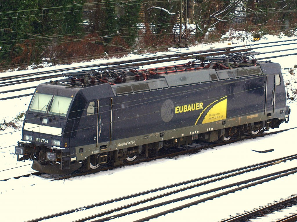 185 573-3 vom Railservice Alexander Neubauer steht auf einem Abstellgleis im Aachener Westbahnhof. Die Lok ist in der lezten Zeit des öfteren hier zu sehen. Das Bild wurde am 02.02.2010 von der Brücke Turmstrasse gemacht. Mario Schürholz