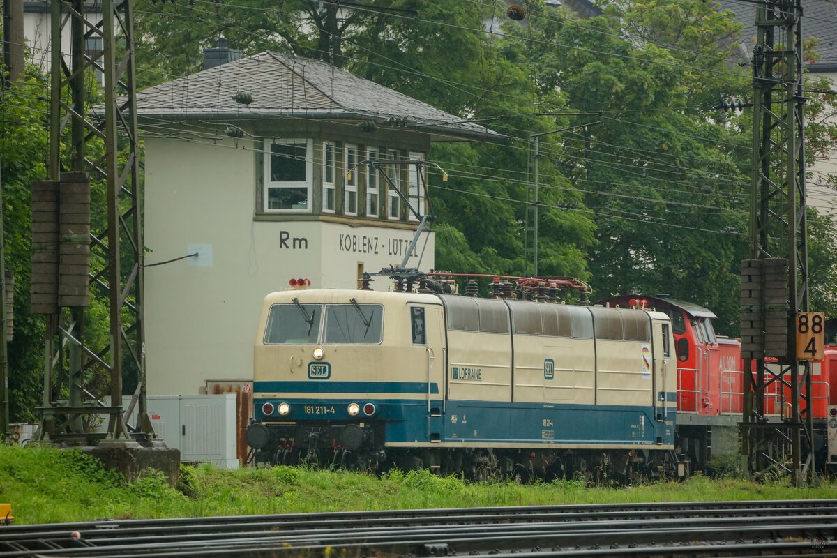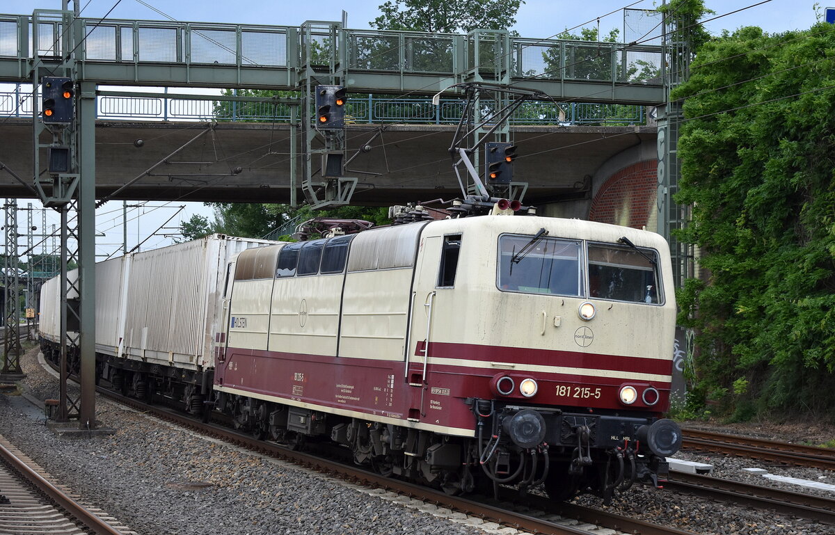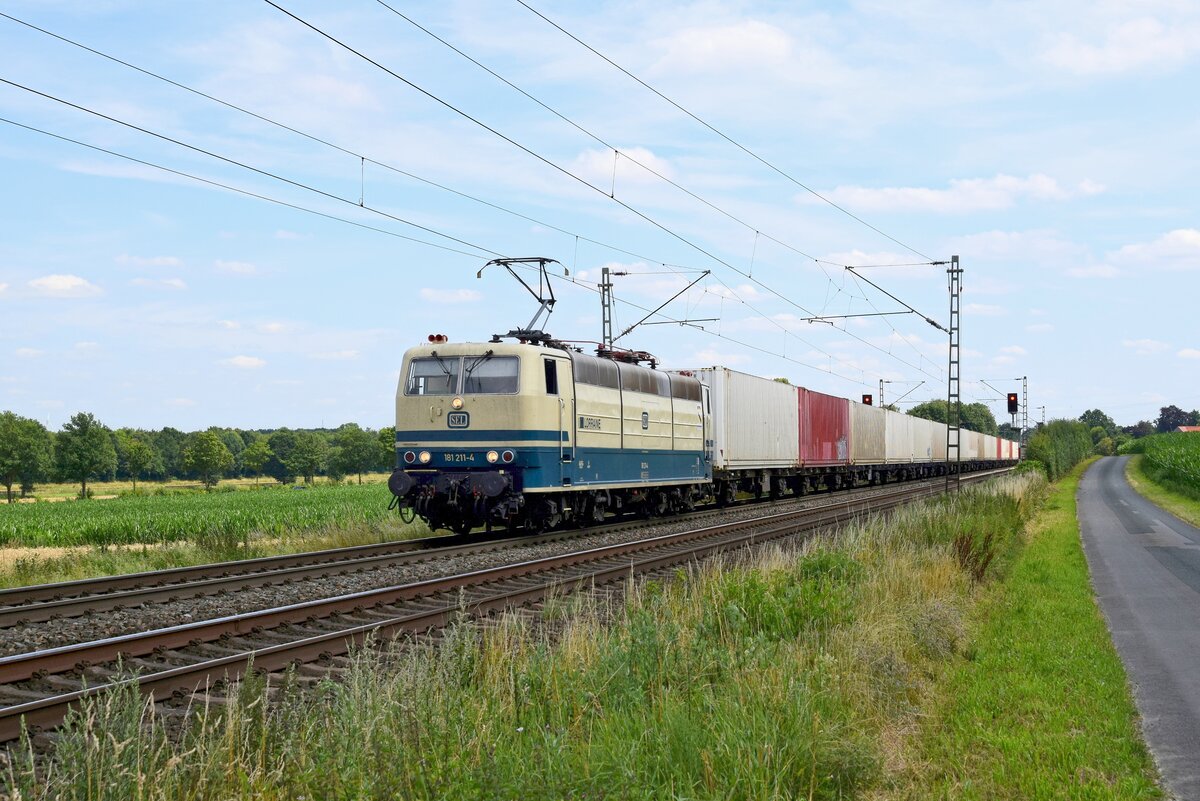 SEL 181 211-4 mit Containerzug in Hamburg Harburg am 18.07.25 vom Bahnsteig aus fotografiert