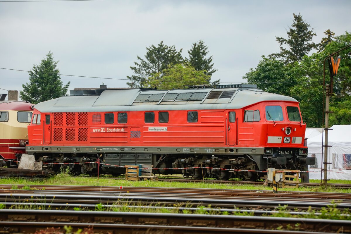 Schlünß Eisenbahn Logistik Ludmilla 234 242-6 mit Hödlmayr Autozug in Hamburg Harburg am 18.07.25 vom Bahnsteig aus fotografiert