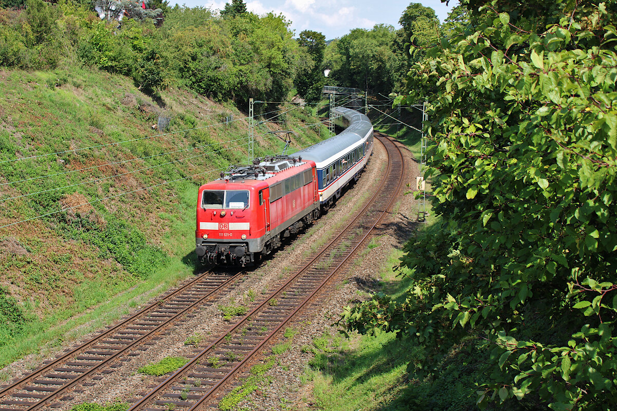 DB 111 121-0 fährt für TRI als RE14b von Stuttgart Hbf nach Böblingen aufgrund der Sperrung des S-Bahn Tunnels. Hier passiert der Zug gerade den ehemaligen Bahnhof Heslach auf der sogenannten Panoramastrecke. (15.08.2023)
