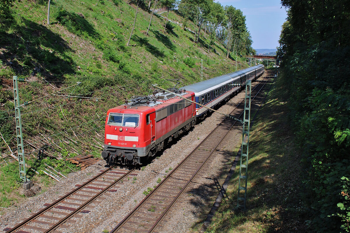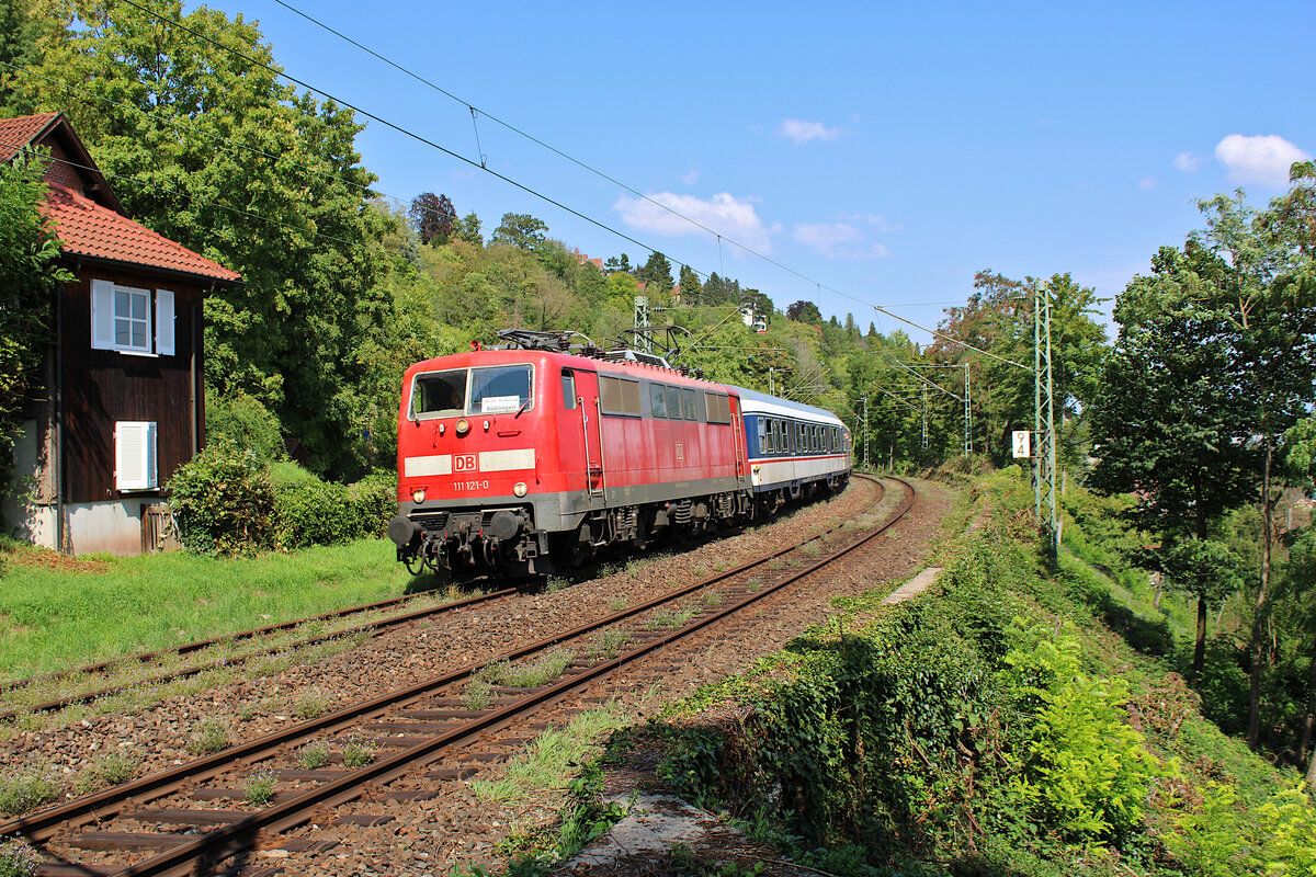 DB 111 121-0 fährt für TRI als RE14b von Stuttgart Hbf nach Böblingen aufgrund der Sperrung des S-Bahn Tunnels. Hier verlässt der Zug gerade den ehemaligen Bahnhof Heslach auf der sogenannten Panoramastrecke. (15.08.2023)
