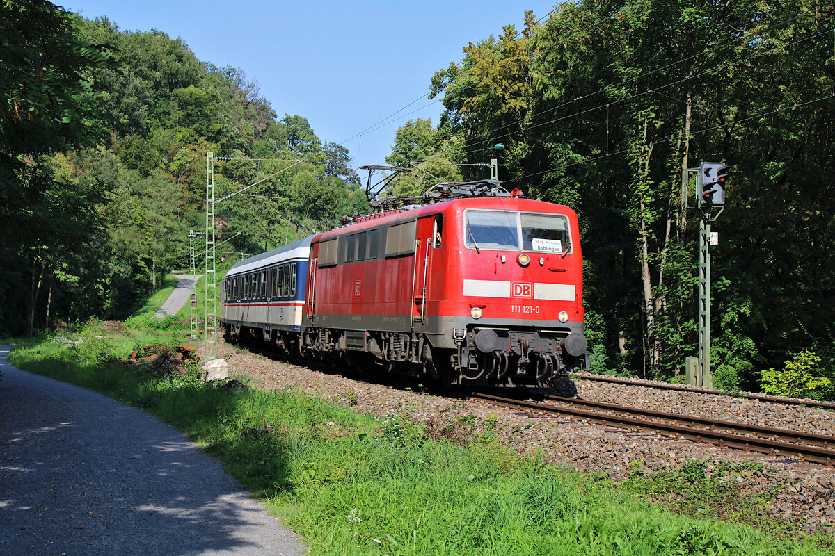 DB 111 121-0 fährt für TRI als RE14b von Stuttgart Hbf nach Böblingen aufgrund der Sperrung des S-Bahn Tunnels, hier kurz vor Stuttgart West. (15.08.2023)