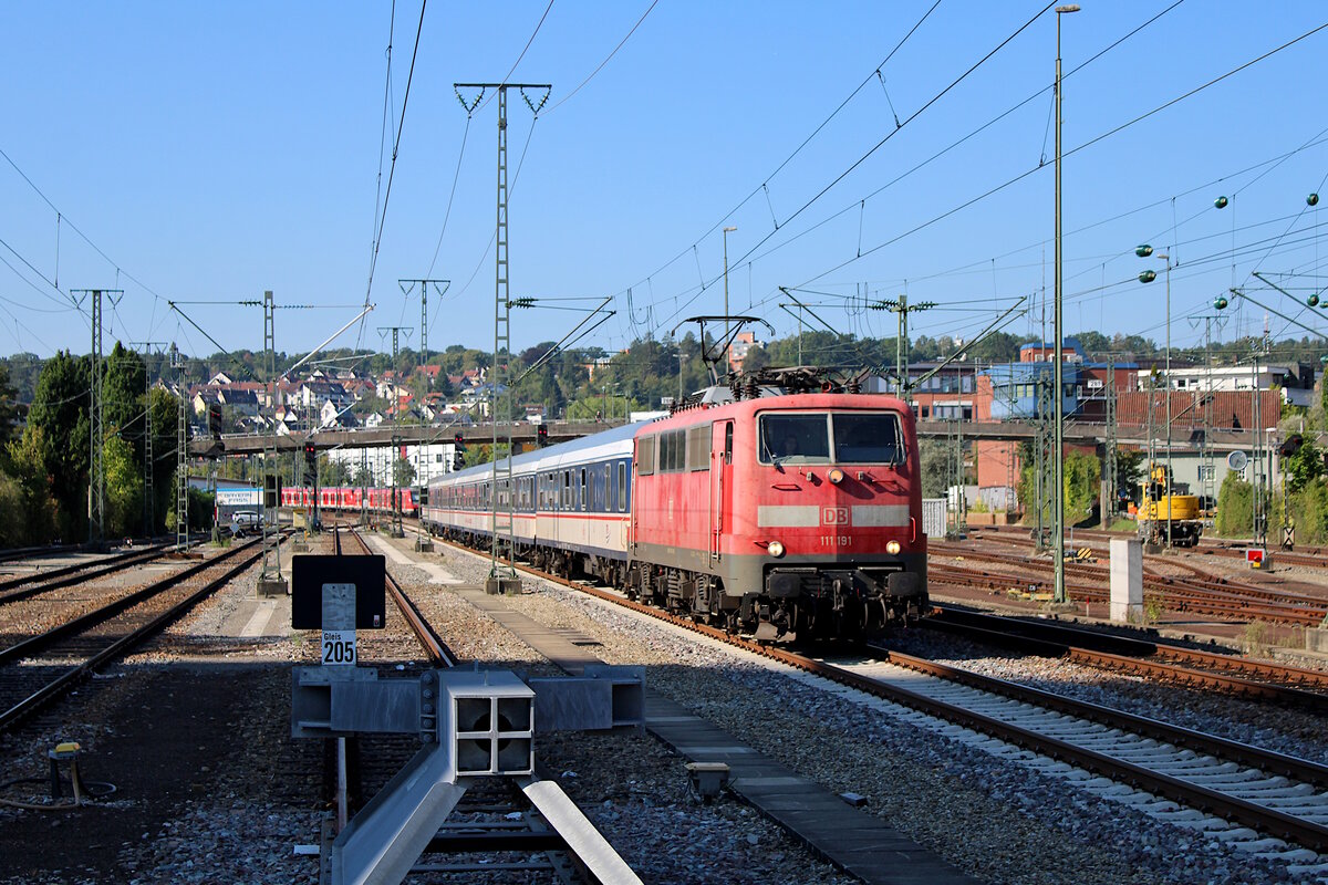 DB 111 191 schiebt ihren RE14-Ersatzzug für TRI aus dem Stuttgarter Hbf in Richtung Böblingen. (08.09.2023)