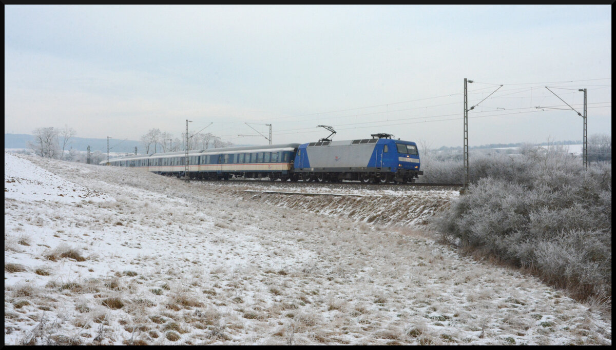 Seit über einem Jahr fährt Train Rental International (TRI) für GoAhead Baden-Württemberg Ersatzverkehr auf dem RE8 Würzburg - Stuttgart. Am bitterkalten 21.01.2024 legt sich die 145-CL 201 mit ihrem n-Wagenzug bei Reichenberg in die Kurve.