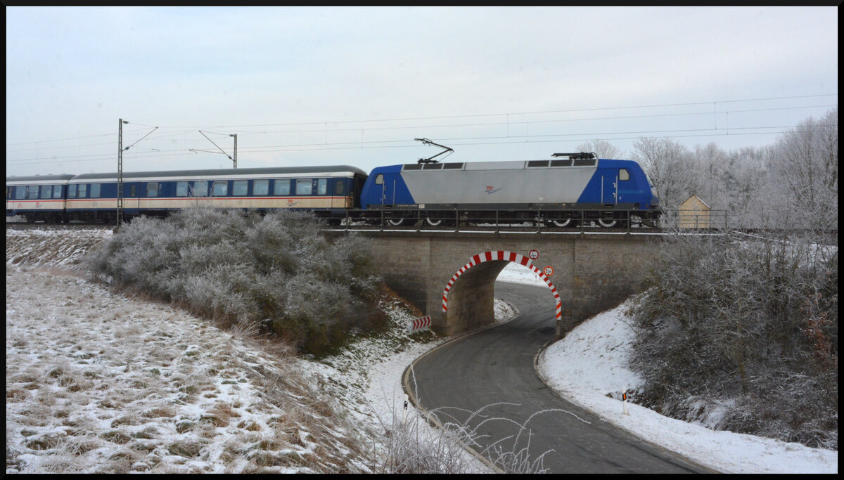 Seit über einem Jahr fährt Train Rental International (TRI) für GoAhead Baden-Württemberg Ersatzverkehr auf dem RE8 Würzburg - Stuttgart. Am bitterkalten 21.01.2024 überquert die 145-CL 201 mit ihrem n-Wagenzug bei Reichenberg diese alte Brücke.