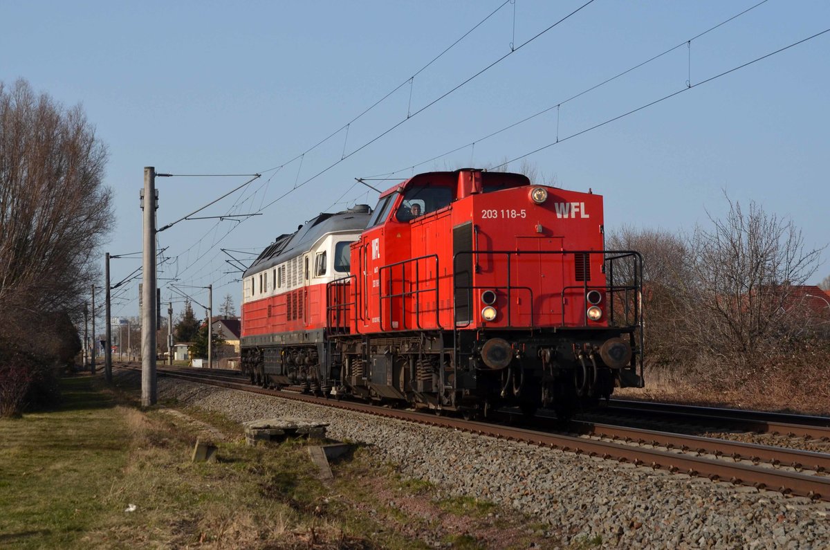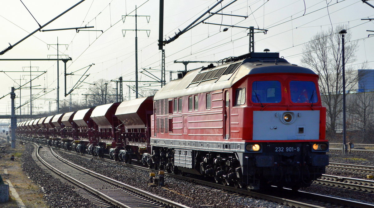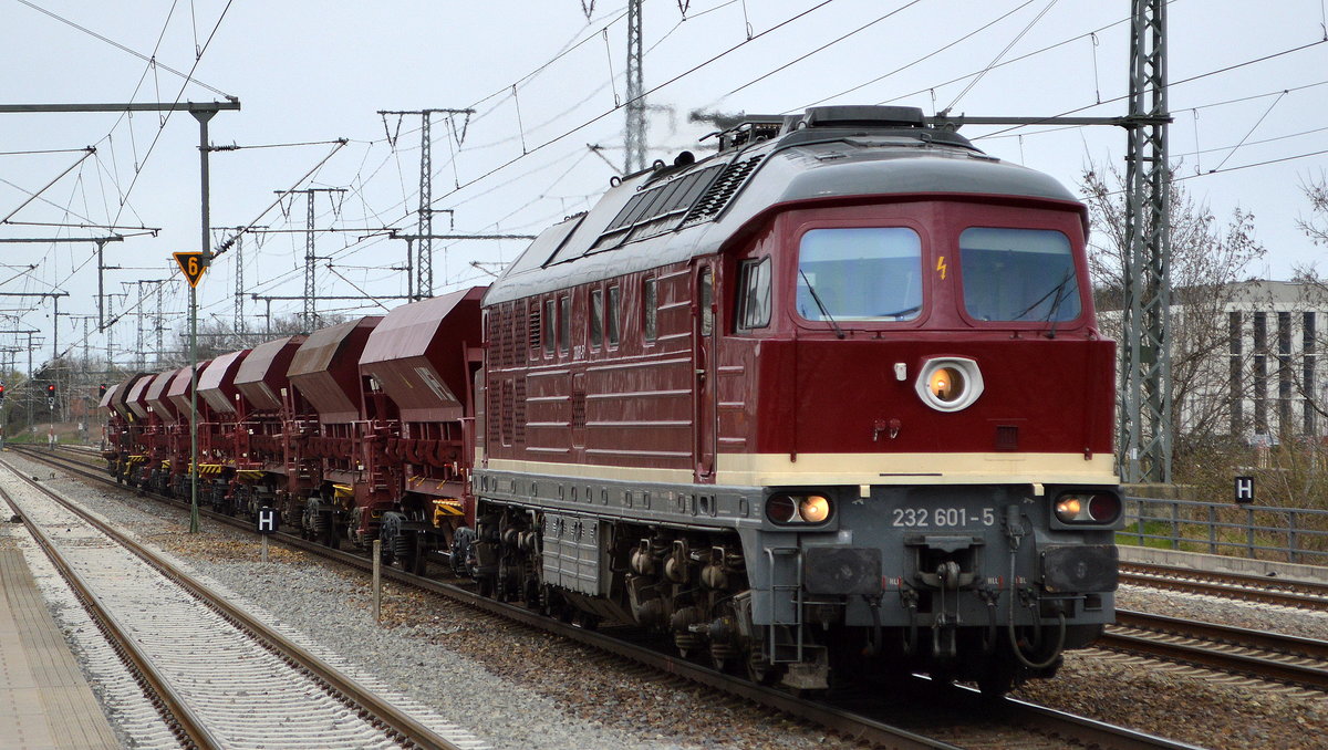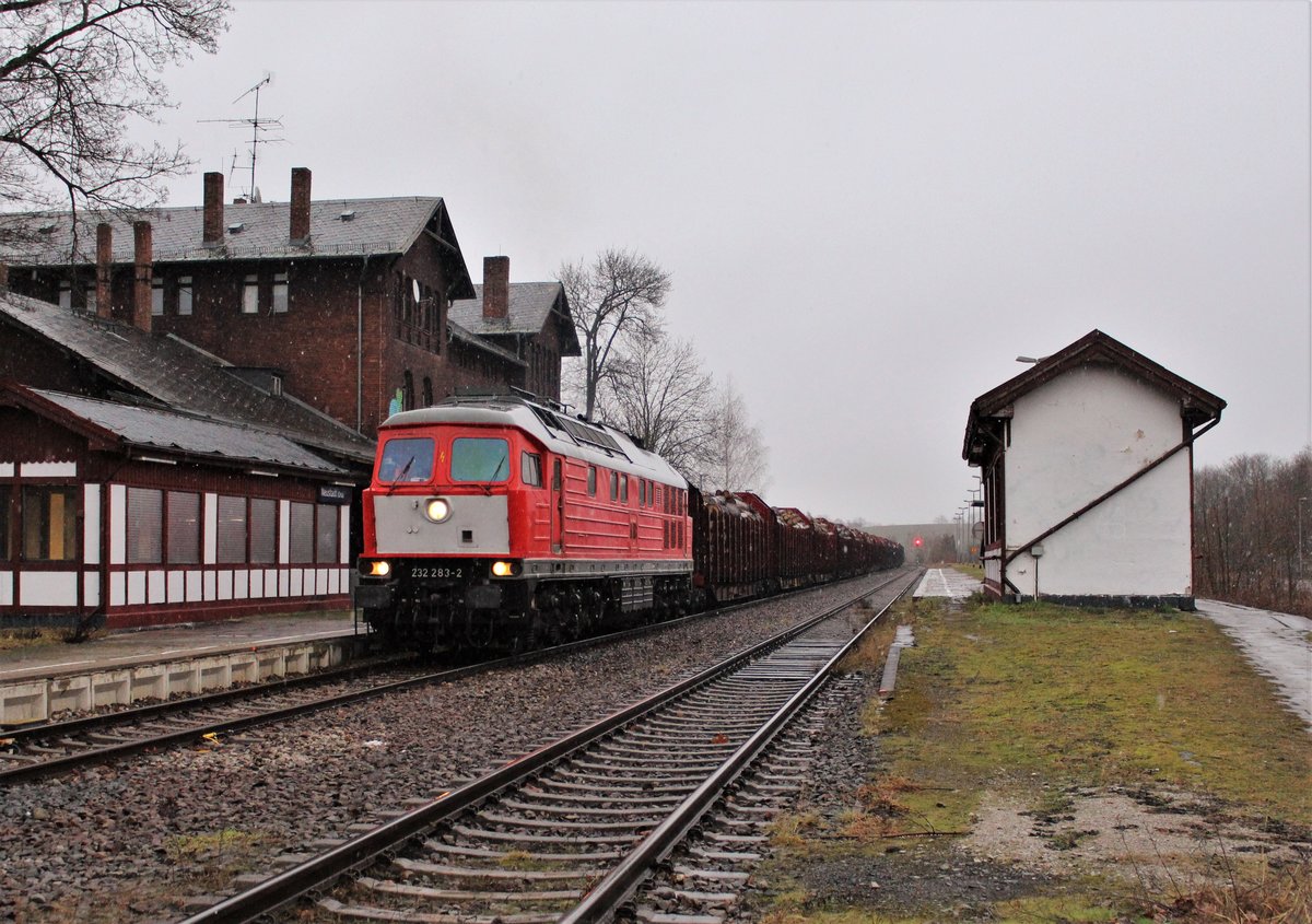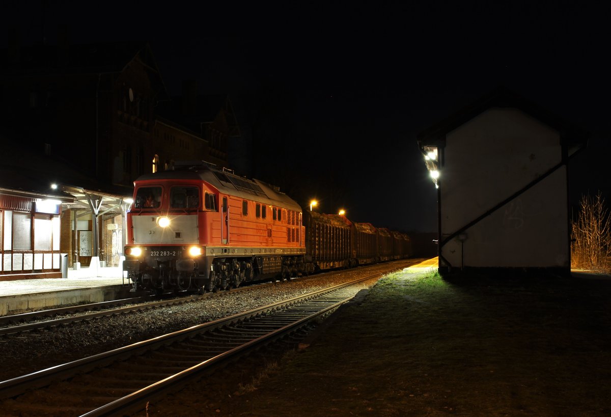232 283-2 zusammen mit 155 159-7 (beide WFL) und einem vollen Holzzug am 12.3.2021 beim abendlichen Kreuzungshalt am Oberen Bahnhof in Pößneck. Der Zug kam aus Triptis und fuhr nach Kaufering Markus Klausnitzer