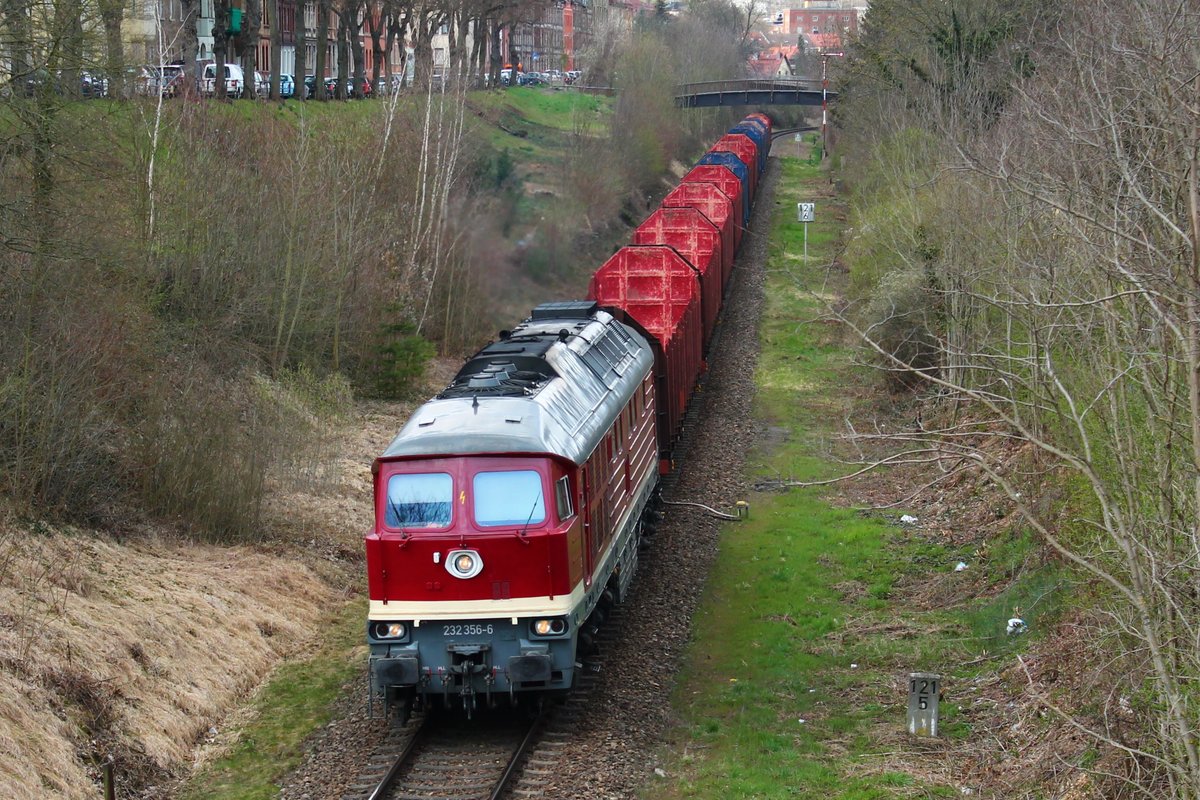 232 333-5 (WFL) am 28.5.2021 mit dem Holzzug aus Triptis bei der Durchfahrt durch Pößneck. Der Zug war auf dem Weg von Triptis nach Kaufering. Am Zugende lief noch 155 159-7 (WFL) mit. Markus Klausnitzer
