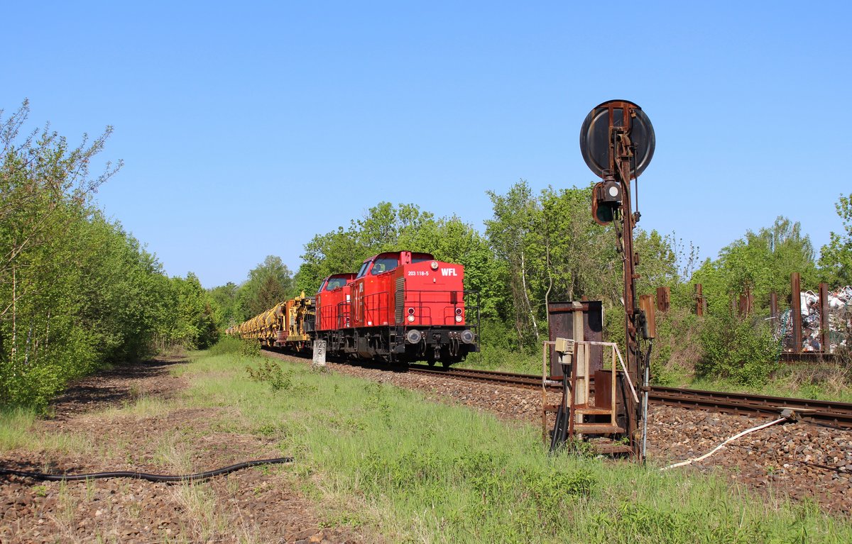 Aktuell finden auf der Strecke Gera-Saalfeld zwischen Neustadt an der Orla und Pößneck oberer Bahnhof Bauarbeiten statt. Am 05.05.18 fuhr WFL 203 118-5 und 203 120-1 mit dem vollen Altschotterzug in Neustadt an der Orla ein. Alexander Hertel