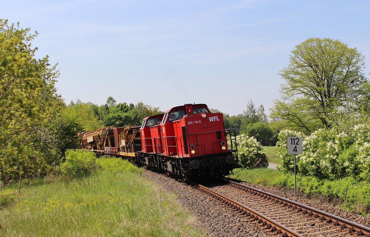 Aktuell finden auf der Strecke Gera-Saalfeld zwischen Neustadt an der Orla und Pößneck oberer Bahnhof Bauarbeiten statt. Am 05.05.18 kam die WFL mit der 203 118-5 und 203 120-1 mit einem Umbauzug von Saalfeld nach Neustadt an der Orla durch Oppurg. Alexander Hertel