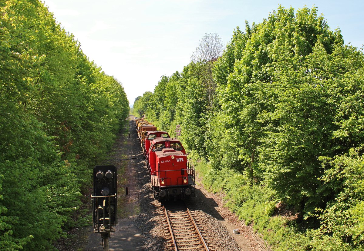 Aktuell finden auf der Strecke Gera-Saalfeld zwischen Neustadt an der Orla und Pößneck oberer Bahnhof Bauarbeiten statt. Am 05.05.18 fuhr WFL 203 118-5 und 203 120-1 mit dem vollen Altschotterzug durch Neunhofen nach Neustadt an der Orla. Alexander Hertel